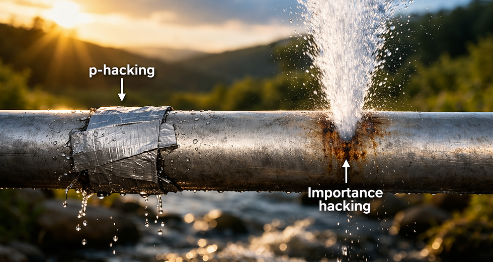 If a pipe is leaking from two holes and its pressure is kept fixed, then repairing one hole will result in the other one leaking faster. Similarly, as best practices increasingly become commonplace as a means to reduce p-hacking, so long as the career pressures to publish in top journals don't let up, the occurrence of Importance Hacking may increase.